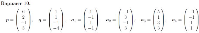- Задача 2. Векторы p и q евклидова пространства Е4 представлены своими координатами в базисе a1, a2, a3, a4, векторы которого в свою очередь представлены своими координатами в некотором ортонормированном базисе.