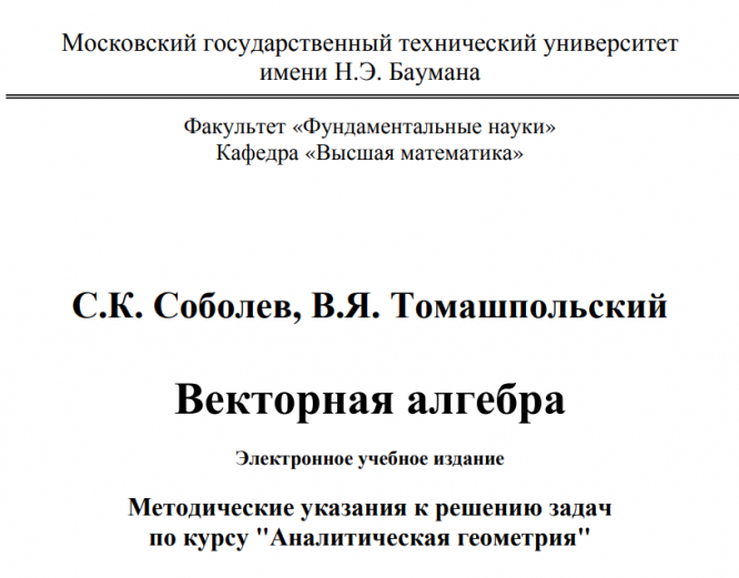 Для студентов МГТУ им. Н.Э.Баумана по предмету Линейная алгебра и аналитическая геометрияСоболев С.К., Томашпольский В.Я. - Векторная алгебраСоболев С.К., Томашпольский В.Я. - Векторная алгебра