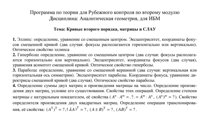Вопросы/задания к контрольной работе: Программа по теории. РК №2, тема «Кривые 2-го порядка, матрицы и СЛАУ»