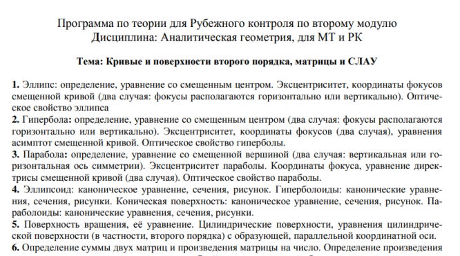 Вопросы/задания к контрольной работе: Программа по теории. РК №2, тема «Кривые и поверхности 2-го порядка, матрицы и СЛАУ»
