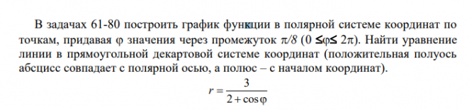 В задачах 61-80 построить график функции в полярной системе координат по точкам, придавая значения через промежуток. Найти уравнение линии в прямоугольной декартовой системе координат (положительная полуось абсцисс совпадает с полярной осью, а полюс – с началом координат).