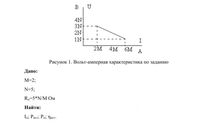 Определить параметры последовательной и параллельной схем замещения источника по известному участку внешней характеристики. Найти ток в приемнике, подключенном к источнику, если сопротивление приемника Rп = (5 N/M) Ом. Найти мощность источника и приемника, а также КПД источника. .