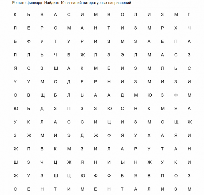 Литература СОО 2023 (ДО, СпДО, ПНК, КП, ПДО, ДОУА, СР 2 часть) Практическое занятие 3. Задание 9 Решите филворд. Найдите 10 названий литературных направлений. .
