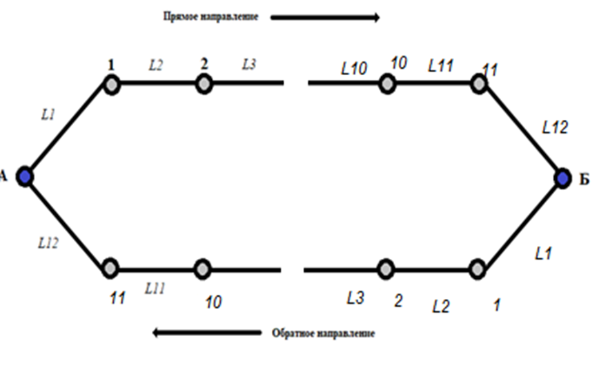 1,2,3,,,, 11– промежуточные остановачные пункты; L1, L2, L3,,,, L12 – длины