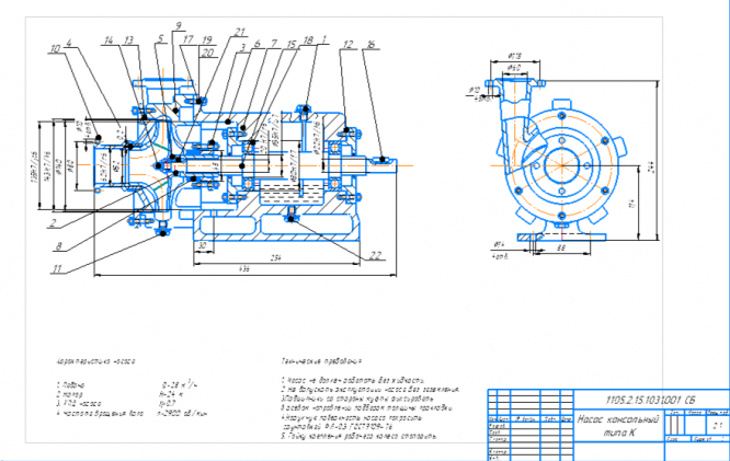 Для студентов МГТУ им. Н.Э.Баумана по предмету Лопастные гидромашиныКонсольный центробежный насос (Q=28, H=24, n=2900, dh=2,2)Консольный центробежный насос (Q=28, H=24, n=2900, dh=2,2)