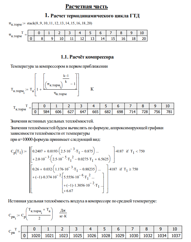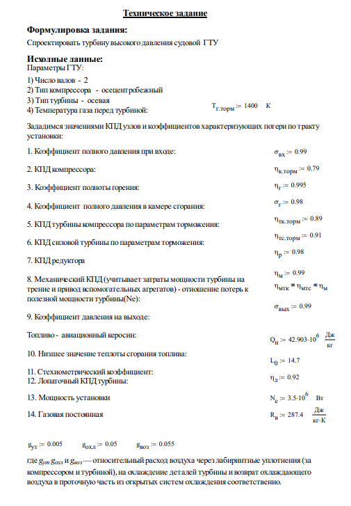 Формулировка задания: Спроектировать турбину высокого давления судовой ГТУ Исходные данные: Параметры ГТУ: 1) Число валов - 2 2) Тип компрессора - осецентробежный 3) Тип турбины - осевая 4) Температура газа перед турбиной: Tг.торм := 1400 К