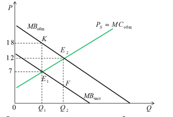На рисунке представлены кривые предельных частных и общественных выгод от производства товара и кривая предельных общественных издержек.