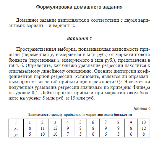 Маркетинг. Парная регрессия. Дз по маркетингу инноваций 5 семестр мгту баумана, парная регрессия. Пространственная выборка, показывающая зависимость при-были (переменная y, измеряемая в млн руб.) от маркетингового бюджета (переменная x, измеряемого в млн руб.), представлена в табл. 6. Определите, как близко уравнение регрессии находится к описываемому линейному отношению. Оцените дисперсии коэф-фициентов парной регрессии. Установите, является ли оправдан-ным прогноз значений прибыли при надежности 0,9. Является ли полученное уравнение регрессии значимым по критерию Фишера на уровне 0,1. Дайте прогноз прибыли при маркетинговом бюд-жете на уровне 5 млн руб.