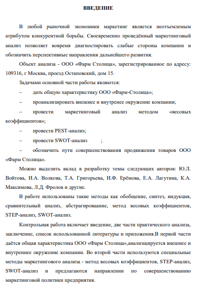 В любой рыночной экономики маркетинг является неотъемлемым атрибутом конкурентной борьбы. Своевременно проведённый маркетинговый анализ позволяет вовремя диагностировать слабые стороны компании и обозначить перспективные направления дальнейшего развития. Объект анализа - ООО «Фарм Столица», зарегистрированное по адресу: 109316, г Москва, проезд Остаповский, дом 15. Задачами основной части работы являются: дать общую характеристику ООО «Фарм-Столица»; проанализировать внешнее и внутренее окружение компании; провести маркетинговый анализ методом «весовых коэффициентов»; провести PEST-анализ; провести SWOT-анализ ; обозначить пути совершенствования продвижения товаров ООО «Фарм Столица». Можно выделить вклад в разработку темы следующих авторов: Ю.Л. Войтова, И.А. Волкова, Т.А. Григорьева, И.Ф. Ерёмова, Е.А. Лагутина, К.А. Максимова, Л.Д. Фролов и другие. В работе использованы такие методы как обобщение, синтез, индукция, сравнительный анализ, абстрагироваание, метод весовых коэффициентов, STEP-анализ, SWOT-анализ.