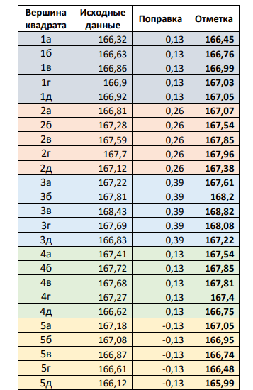 По полученным величинам исходных данных следует построить план площадки и горизонтали рельефа. Используя абсолютные отметки индивидуального задания, определить проектную (красную) отметку будущей горизонтальной площадки. Определить объемы выемки и насыпи земляных работ, сравнить полученные результаты