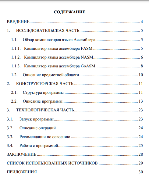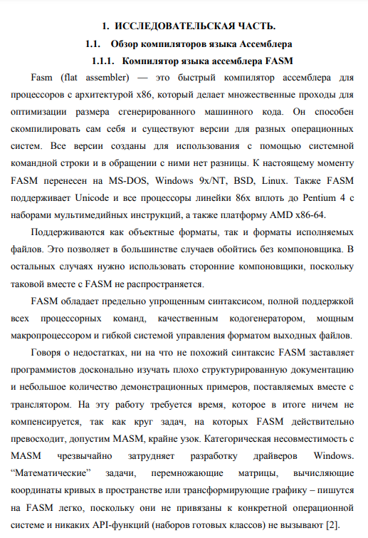 Ассемблер (с англ. Assembler - сборщик) — язык программирования, сущность которого хорошо отражает ЭВМ архитектуру. Язык ассемблера — запись машинного кода, представленный в символьном виде, применение которого намного упрощает создание машинных программ. Для одной и той же электронно-вычислительной машины могут быть разработаны разные языки ассемблера. В отличие от языков высокого уровня, в которых достаточно много проблем исполнения алгоритмов скрыты от разработчиков программ, язык ассемблера очень тесно связан с целой системой микропроцессорных команд. Для идеального микропроцессора, у которого система команд соответствует языку программирования, ассемблер создает по единственному машинному коду на каждый оператор языка. В действительности на практике, для реальных микропроцессоров может потребоваться два, три или несколько машинных команд для реализации только одного оператора языка. Главное достоинство языка ассемблера — «приближенность» к процессору, который является основой используемого программистом компьютера, а главным неудобством — слишком мелкое деление типовых операций, которое большинством пользователей воспринимается очень сложно. Однако язык ассемблера в значительно большей степени отражает само функционирование компьютера, чем все остальные языки [1]. На языке ассемблера пишут программы или их фрагменты чаще всего в тех случаях, когда очень важны:  Быстродействие программы  объем используемой памяти Оптимально написанной можно считать программу, которая работает правильно, по возможности быстро и занимает, возможно, малый объем памяти.