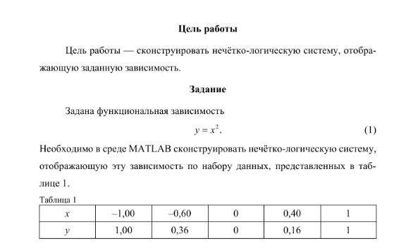 Необходимо в среде MATLAB сконструировать нечётко-логическую систему, отображающую эту зависимость по набору данных, представленных в таблице 1
