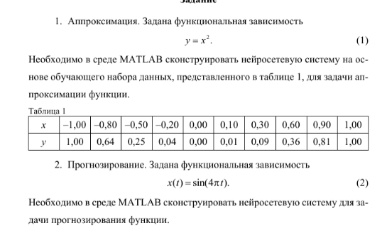 Необходимо в среде MATLAB сконструировать нейросетевую систему на основе обучающего набора данных, представленного в таблице 1, для задачи аппроксимации функции.