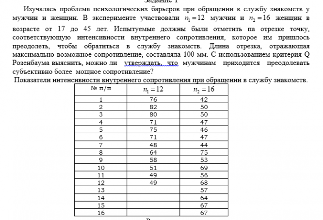 Изучалась проблема психологических барьеров при обращении в службу знакомств у мужчин и женщин. В эксперименте участвовали мужчин и женщин в возрасте от 17 до 45 лет. Испытуемые должны были отметить па отрезке точку, соответствующую интенсивности внутреннего сопротивления, которое им пришлось преодолеть, чтобы обратиться в службу знакомств. Длина отрезка, отражающая максимально возможное сопротивление, составляла 100 мм. С использованием критерия Q Розенбаума выяснить, можно ли утверждать, что мужчинам приходится преодолевать субъективно более мощное сопротивление?