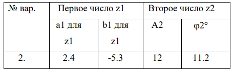 Задание 1. В таблице 2.2 заданы два комплексных числа – первое число в нормальной форме, а второе в экспоненциальной. Согласно своему варианту средствами MathCAD для первого числа найдите модуль и аргумент в градусах, а второе число переведите в нормальную форму по соотношениям. Сложите, вычтите, умножьте и поделите два числа представленных в нормальной форме.