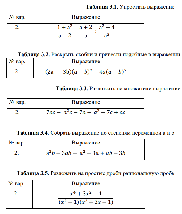 Задание 1. Упростите приведенные в таблицах 3.1 – 3.5 выражения с использованием функций simplify, еxpand, factor, collect и parfrac
