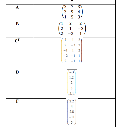 Матрицы: Даны три матрицы А, B, C и два вектора d и f (таблица 5.1). Средствами MathCAD: 1) задайте в рабочем документе матрицы и вектора; рассчитайте: 2) А + B, А – B; 3) 3  C, 5 + В; 4) АB, BА, AC и ААT ; 5) сформируйте единичную матрицу 3-го и 5-го порядков; 6) из векторов D и F получите диагональные матрицы; вычислите: 7) Sp(A), Sp(B); 8) det(A), det(B); 9) А -1 и B -1 и проверьте правильность нахождения обратных матриц; 10) А 0 , B 0 , А -2 , B -2 , А 2 , B 2 , А -3 , B -3 ; 11) rank(A), rank(B); 12) 5  d, –2 + f; 13) d + f, d – f; 14) скалярное и внешнее произведение векторов d и f; 15) Cd, Cf; 16) ||d||, ||f||; 17) угол между векторами d и f; 18) найдите векторное произведение элементов первых столбцов матриц A и B;
