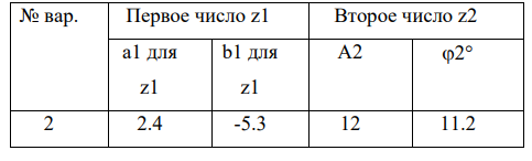 Задание 2.1. В таблице 2.2 заданы два комплексных числа – первое число в нормальной форме, а второе в экспоненциальной. Согласно своему варианту средствами MathCAD найдите модуль и аргумент в градусах заданного числа, а второе число переведите в нормальную форму. Сложите, вычтите, умножьте и поделите два числа представленных в нормальной форме.