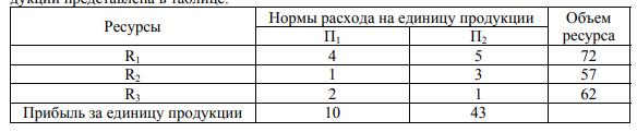 Предприятие может выпускать продукцию двух видов. Используются три вида ресурсов: R1, R2 и R3. Нормы расхода, лимиты ресурсов и прибыль от реализации единицы продукции представлена в таблице