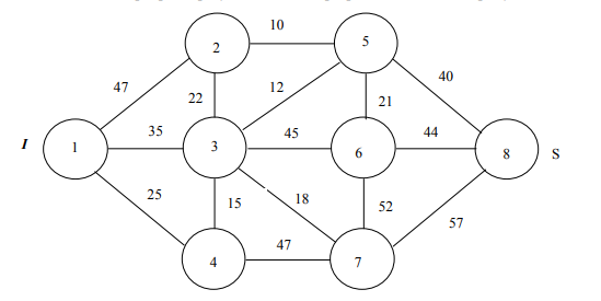 На заданной сети сформировать на поток максимальной мощности, направленный из истока I в сток S, при условии, что пропускные способности ребер в обоих направлениях одинаковы. Выписать ребра, образующие на сети разрез минимальной пропускной способности.