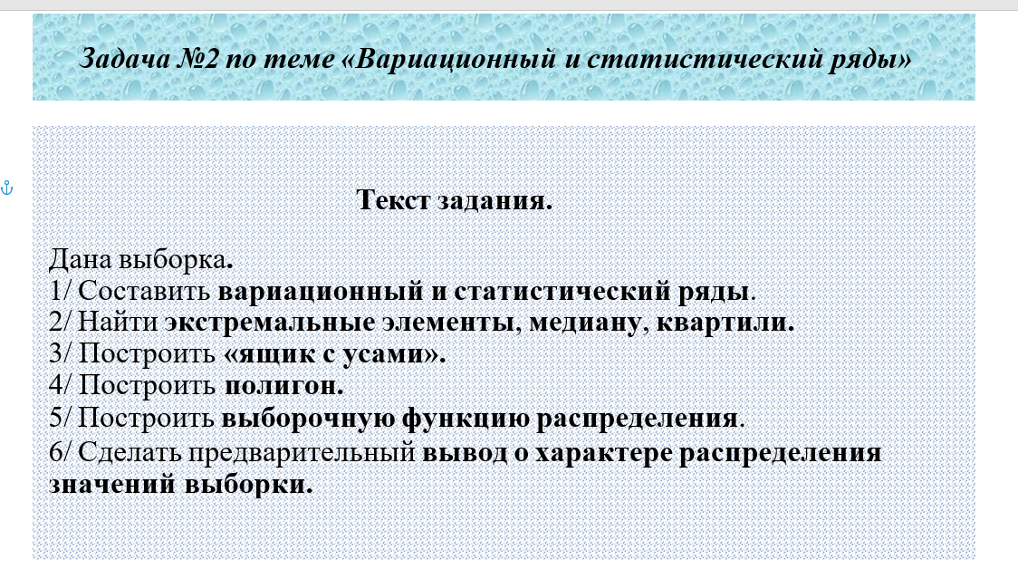 6/ Сделать предварительный вывод о характере распределения значений выборки.