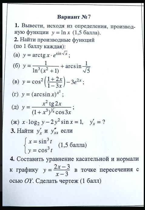 Для студентов МГТУ им. Н.Э.Баумана по предмету Математический анализКонтрольная по производным 7 ВариантКонтрольная по производным 7 Вариант
