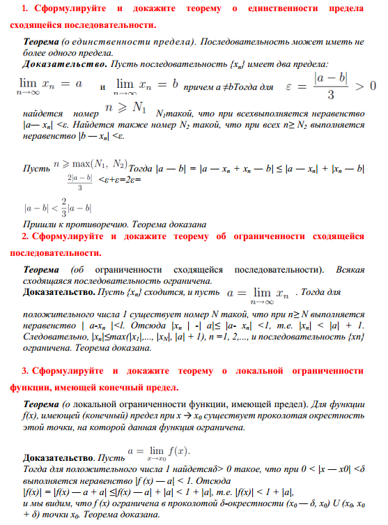 1. Сформулируйте и докажите теорему о единственности предела сходящейся последовательности. [Л. 4]