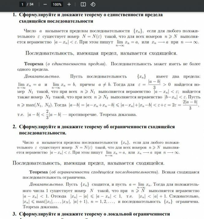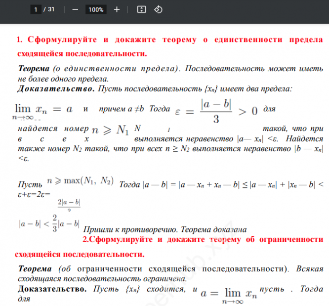 1. Сформулируйте и докажите теорему о единственности предела сходящейся последовательности.