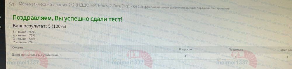 Курс Математический анализ - КМ-7. Дифференциальные уравнения высших порядков. Тестирование - 100%
