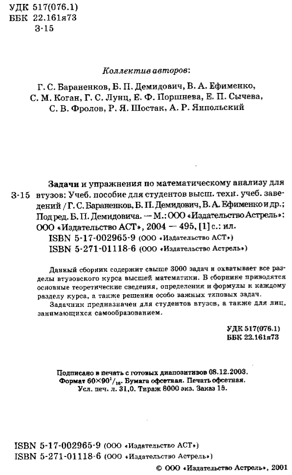 Для студентов по предмету Математический анализБараненков Г. С., Демидович Б. П., Ефименко В. А. - Задачи и упражнения по математическому анализу для втузов - 2004Бараненков Г. С., Демидович Б. П., Ефименко В. А. - Задачи и упражнения по математическому анализу для втузов - 2004