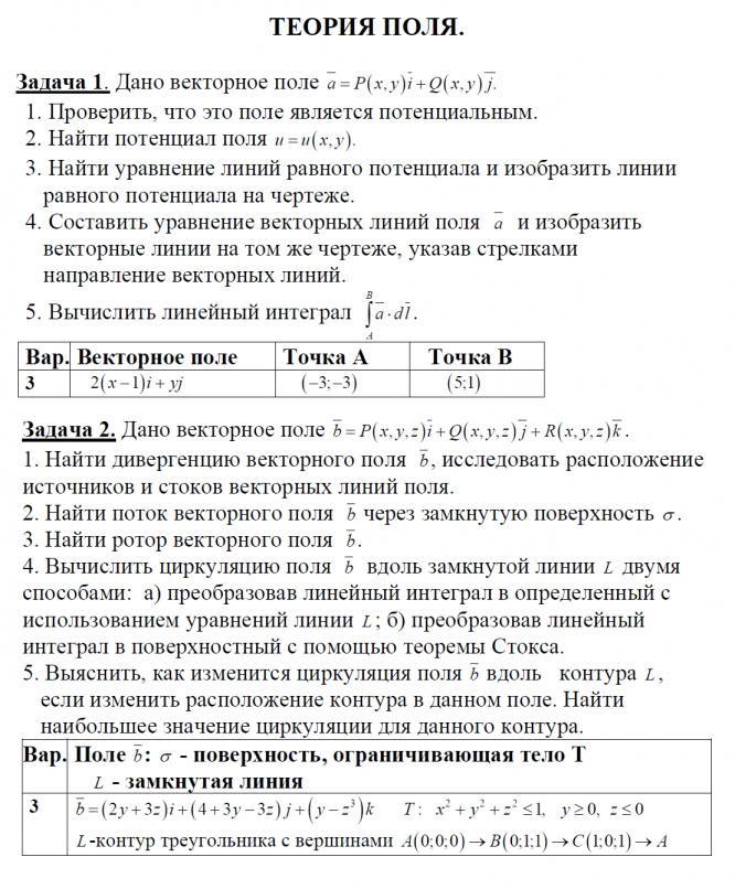 ТЕОРИЯ ПОЛЯ. Задача 1. Дано векторное поле 1. Проверить, что это поле является потенциальным. 2. Найти потенциал поля 3. Найти уравнение линий равного потенциала и изобразить линии равного потенциала на чертеже. 4. Составить уравнение векторных линий поля и изобразить векторные линии на том же чертеже, указав стрелками направление векторных линий. 5. Вычислить линейный интеграл . Задача 2. Дано векторное поле . 1. Найти дивергенцию векторного поля , исследовать расположение источников и стоков векторных линий поля. 2. Найти поток векторного поля через замкнутую поверхность . 3. Найти ротор векторного поля . 4. Вычислить циркуляцию поля вдоль замкнутой линии двумя способами: а) преобразовав линейный интеграл в определенный с использованием уравнений линии ; б) преобразовав линейный интеграл в поверхностный с помощью теоремы Стокса.