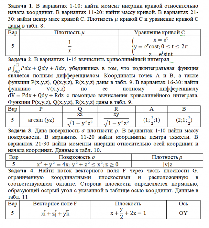 Задача 1. В вариантах 1-10: найти момент инерции кривой относительно начала координат. В вариантах 11-20: найти массу кривой. В вариантах 21-30: найти центр масс кривой С. Плотность кривой С и уравнение кривой С даны в табл. 8. Задача 2. В вариантах 1-15 вычислить криволинейный интеграл , убедившись в том, что подынтегральная функция является полным дифференциалом. Координаты точек Aи B, а также функции P(x,y,z), Q(x,y,z), R(x,y,z) даны в табл. 9. В вариантах 16-30: найти функцию V(x,y,z) по ее полному дифференциалу с помощью вычисления криволинейного интеграла. Функции P(x,y,z), Q(x,y,z), R(x,y,z) даны в табл. 9. Задача 3.