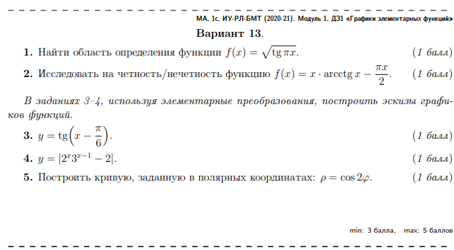 Типовой расчет по математическому анализу №1 "Элементарные функции и их графики", 5 задач, зачтено
