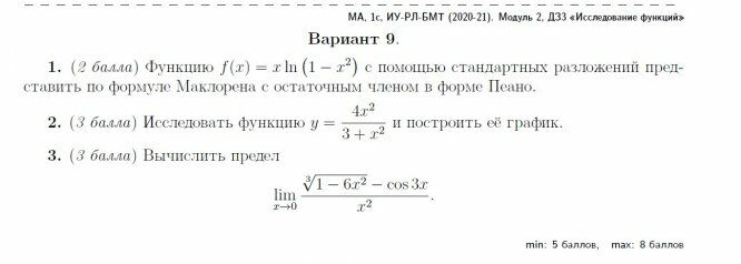 В файле выполненное ДЗ-3 по курсу математический анализ для 9 варианта факультетов ИУ-РЛ-БМТ. Красивый почерк и хорошо начерченные графики. Условие ниже