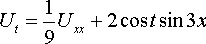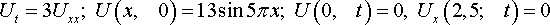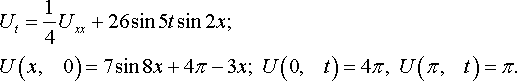 Решить смешанную задачу для данного неоднородного уравнения теплопроводности с нулевыми начальными и граничными условиями: U(x, 0) = 0, U(0, t) = 0, U(π, t) = 0