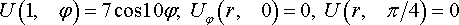 Решить задачу Дирихле для уравнения Лапласа ΔU = 0 в круге 0 ≤ r < 1, 0 ≤ ϕ < 2π (r, ϕ – полярные координаты), на границе которого искомая функция U(r, ϕ) имеет следующие значения: