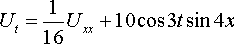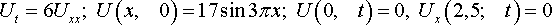 Решить смешанную задачу для данного неоднородного уравнения теплопроводности с нулевыми начальными и граничными условиями: U(x, 0) = 0, U(0, t) = 0, U(π, t) = 0