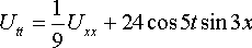 Решить смешанную задачу для данного неоднородного уравнения теплопроводности с нулевыми начальными и граничными условиями: U(x, 0) = 0, U(0, t) = 0, U(π, t) = 0