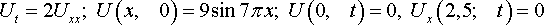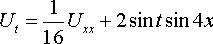 Решить смешанную задачу для данного неоднородного уравнения теплопроводности с нулевыми начальными и граничными условиями: U(x, 0) = 0, U(0, t) = 0, U(π, t) = 0