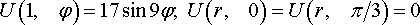 Решить задачу Дирихле для уравнения Лапласа ΔU = 0 в круге 0 ≤ r < 1, 0 ≤ ϕ < 2π (r, ϕ – полярные координаты), на границе которого искомая функция U(r, ϕ) имеет следующие значения: