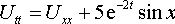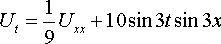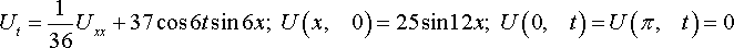 Решить смешанную задачу для данного неоднородного уравнения теплопроводности с нулевыми начальными и граничными условиями: U(x, 0) = 0, U(0, t) = 0, U(π, t) = 0