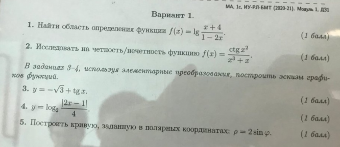 Типовой расчет по математическому анализу №1 "Элементарные функции и их графики", 5 задач, зачтено