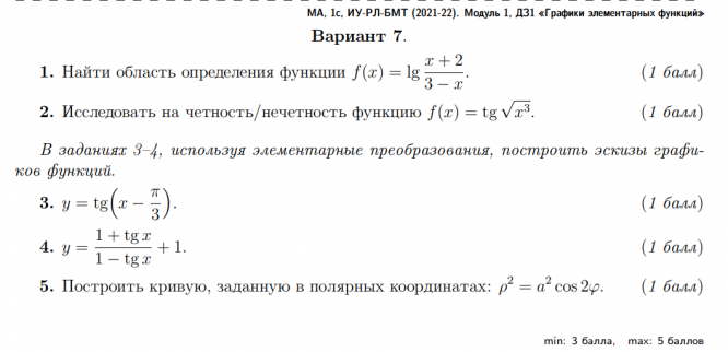 Вариант 7 – ДЗ №1 - Элементарные функции и их графики - ИУ,РЛ,БМТ,ФН12 (нет задача 5)