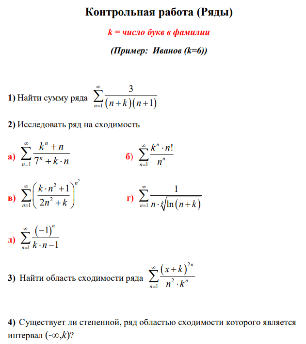 Контрольная работа (Ряды)k = число букв в фамилии(Пример: Иванов (k=6))1)Найти сумму ряда()()131nnkn∞=++∑2)Исследовать ряд на сходимостьа)17nnnknkn∞=++⋅∑б)1!nnnknn∞=⋅∑в)222112nnknnk∞=⋅++∑г)()11lnknnnk∞=⋅+∑д)()111nnkn∞=−⋅−∑3) Найти область сходимости ряда()221nnnxknk∞=+⋅∑4)Существует ли степенной, ряд областью сходимости которогоявляется интервал (-∞,k)? .