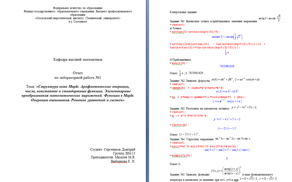 Для студентов НИУ «МЭИ» по предмету Математический анализСтруктура окна Maple. Арифметические операции, числа, константы и стандартные функции. Элементарные преобразования математических выражений. Функции вСтруктура окна Maple. Арифметические операции, числа, константы и стандартные функции. Элементарные преобразования математических выражений. Функции в
