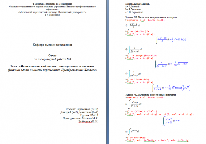 Главная » Учебные материалы » Математический анализ » Лабораторные работы » НИУ «МЭИ» » 1 семестр » Номер 4 » Математический анализ: интегральное исчисление функции одной и многих переменных. Преобразование Лапласа