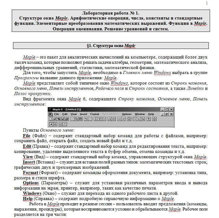 Для студентов НИУ «МЭИ» по предмету Математический анализСтруктура окна Maple. Арифметические операции, числа, константы и стандартные функции. Элементарные преобразования математических выражений. Функции вСтруктура окна Maple. Арифметические операции, числа, константы и стандартные функции. Элементарные преобразования математических выражений. Функции в