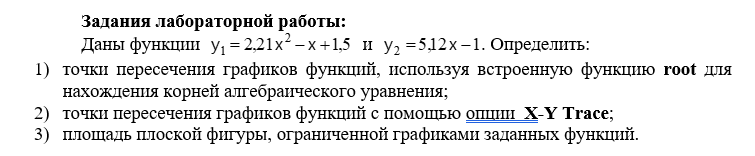 Цель работы: использование операторов и функций MathCAD при решении задач математического анализа: определение точек пересечения графиков двух функции; вычисление определенного интеграла; нахождение площади плоской фигуры.