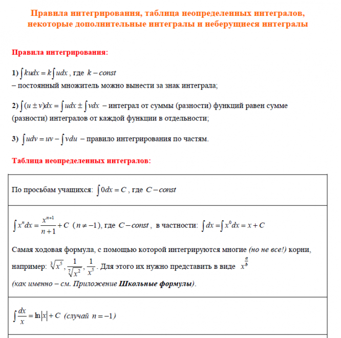Лекции: Правила интегрирования, таблица неопределнных интегралов, некоторые дополнительные интегралы и неберущиеся интегралы