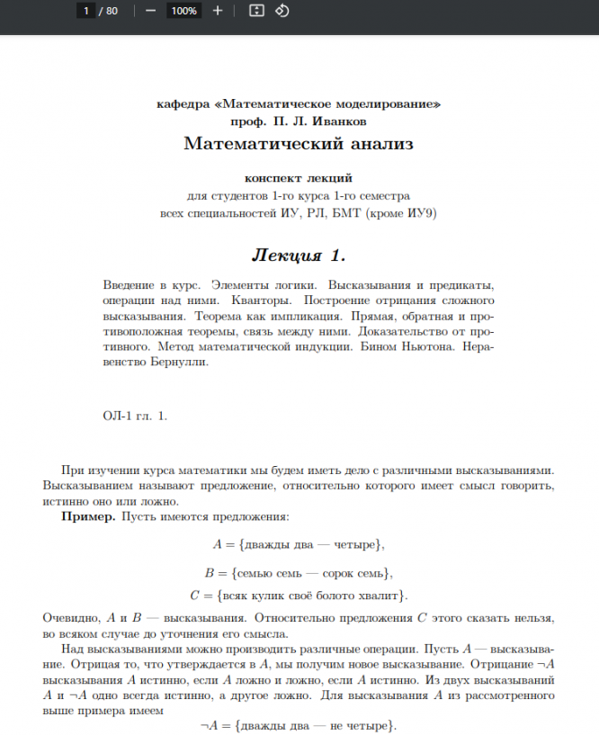 Математический анализ конспект лекций для студентов 1-го курса 1-го семестра всех специальностей ИУ, РЛ, БМТ (кроме ИУ9) проф. П. Л. Иванков 16 ЛЕКЦИЙ Лекция 1. Введение в курс. Элементы логики. Высказывания и предикаты, операции над ними. Кванторы. Построение отрицания сложного высказывания. Теорема как импликация. Прямая, обратная и противоположная теоремы, связь между ними. Доказательство от противного. Метод математической индукции. Бином Ньютона. Неравенство Бернулли. Лекция 2. Множества, операции над ними, их свойства. Множество действительных чисел, его полнота. Промежутки. Окрестности конечной точки и бесконечности. Принцип вложенных отрезков. Ограниченные и неограниченные множества.